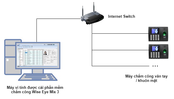 Trên máy tính của nhân viên được phân công theo dõi chấm công sẽ được cài phần mềm chấm công Wise Eye Mix 3, chi tiết hướng dẫn sử dụng của phần mềm này được thể hiện ở một trang khác. Trên phần mềm chúng ta khai báo máy chấm công với IP của máy chấm công trên. Dữ liệu nhân viên đã đăng ký trên máy chấm công được tải về là lưu lại trên dữ liệu phần mềm, ta tiến hành đặt tên nhân viên và phân ra các phòng ban cho dễ theo dõi việc chấm công. Phần mềm được thiết lập ca làm việc theo từng lịch trình được đinh sẵn các thông số của nó. Các nhân viên được xếp vào một lịch trình. Hàng ngày hay hàng tuần chúng ta dùng phần mềm này để tải các sự kiện chấm công về phần mềm và xem công, xuất báo biểu. Tất cả các báo biểu được mở bằng MS Excel.