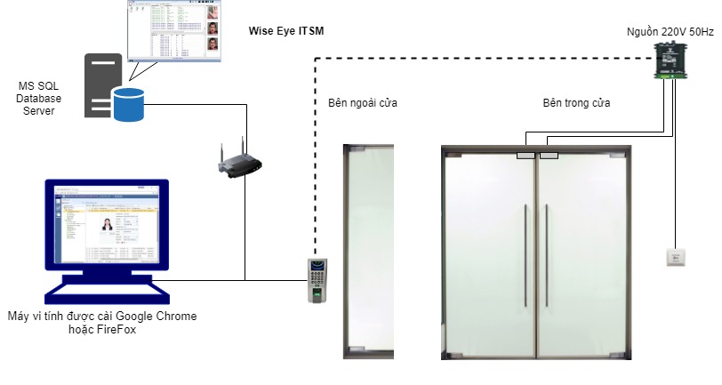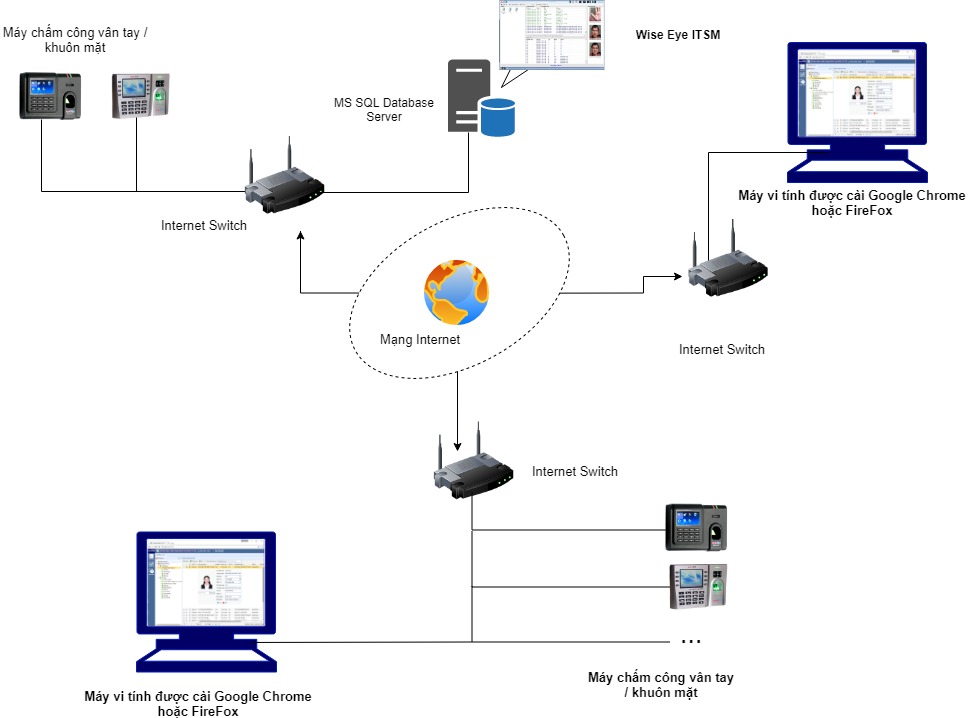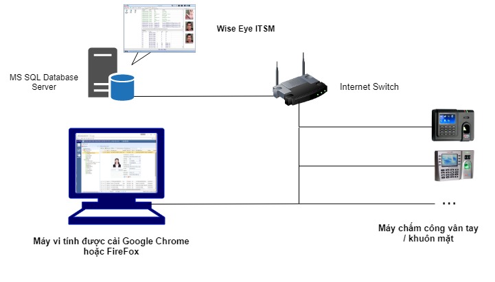 Quý khách vui lòng xem giới thiệu thêm phần lắp đặt máy chấm công ở Giải Pháp 1 hoặc Giải Pháp 2. Ở giải pháp này chúng tôi giới thiệu đến quý khách chấm công với phần mềm chấm công được chạy với trình duyệt web như FireFox, Google Chrome, Microsoft Edge … hay còn gọi là chấm công trên web. Tại trung tâm chúng ta cài phần mềm Wise Eye Web ITS hay phiên bản mới hơn là Wise Eye ITS V2.0 và thiết lập cho nó chạy với một cổng mạng (port), ví dụ cổng 8000, rồi mở cổng này trong trường hợp chúng ta muốn truy cập phần mềm ở mạng Internet.